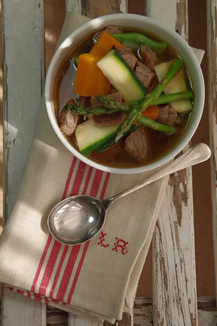 Navarin comes from the French word for turnip, navet, and it was originally the main vegetable used in this dish, however Trish Deseine's version from her cookbook Trish's French Kitchen is the springtime version. I realise it's not springtime at the moment in Melbourne, but it is in France and I'm pretending I'm French anyway so c'est la vie!